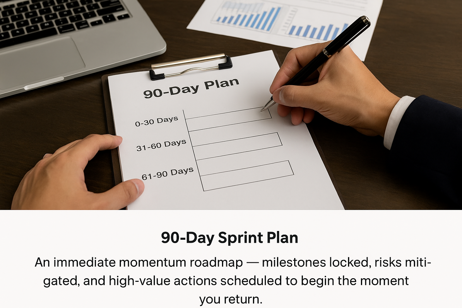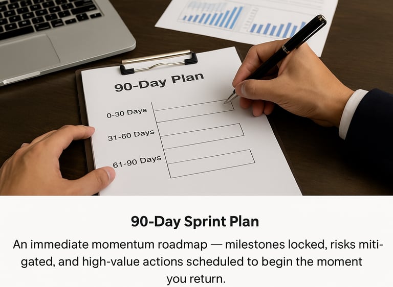An immediate momentum roadmap — milestones locked, risks mitigated, and high-value actions scheduled to begin the moment you return.